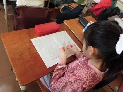 国語では、学習材を段落できりとったものの貼り付けをしています。説明文の中で取り上げられている事例や問題提起、まとめ、接続語などを手掛かりに文章の構成を捉えます。