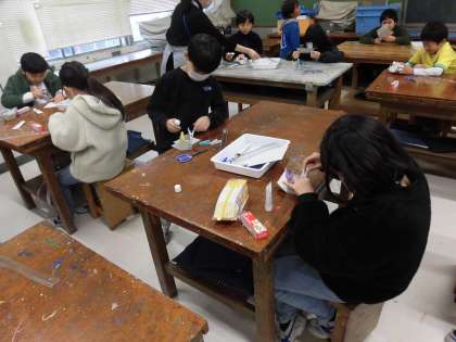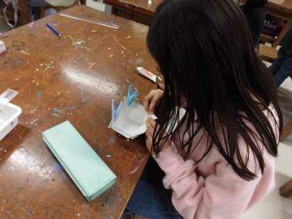図工の「用具を使って、はこがたを作ろう」の学習です。洗濯ばさみでしっかりと押さえながら、オリジナルのはこがたを作っています。