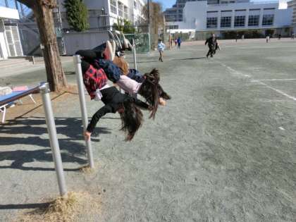 1年生が縄跳びで遊んでいます。いろいろな技を見せてくれました。2年生が鉄棒でこうもりふりをやっています。振れ幅がとても大きいです。逆さ感覚がすごいですね。校舎から、「校長先生!」と、声か聞こえます。振り向くと、3年生が手を振ってくれています。その上の階を見ると、6年生も手を振ってくれています。池尻小の子どもたちは、みんなかわいいです。