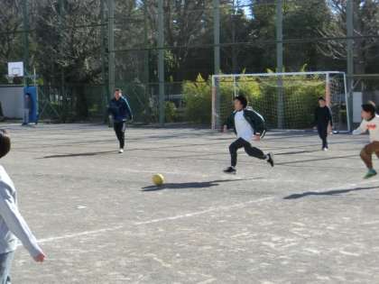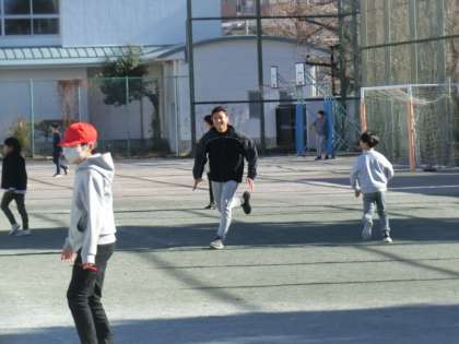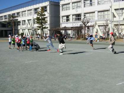 中休みになりました。朝はとても寒かったのですが、お日さまが照り付け、あたたかく感じます。おにごっこをやって走り回っている高学年の人たちがいます。すごい迫力です。先生たちも遊びに参加しています。
