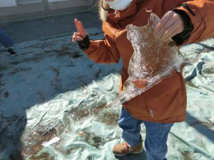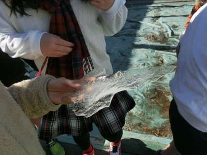 砂場のシートに上に大きな氷が張っているのです。すごい厚みです。子どもたちはとてもうれしそうです。今朝、寒く感じたはずですね。