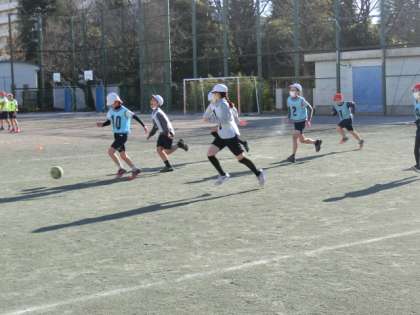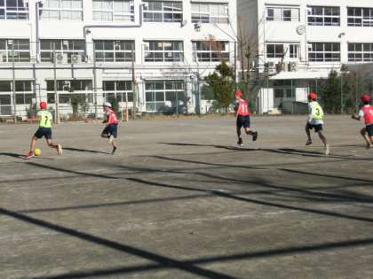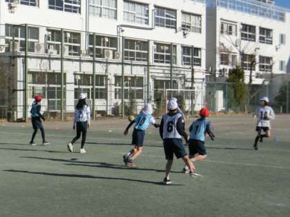 2組の授業は体育でした。サッカーです。男の子も女の子も混じって、ボールを追いかけています。6年生になると、蹴るボールに勢いがあり、すごい迫力です。