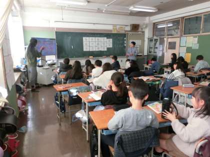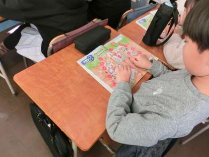 4年生ではALTの先生による外国語の授業でした。学校の中で好きな場所を決め、それを案内し合っています。子どもたちは、「Turn right」「Turn left」の声に合わせ、教科書の学校の図を指でなぞっていました。