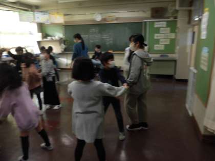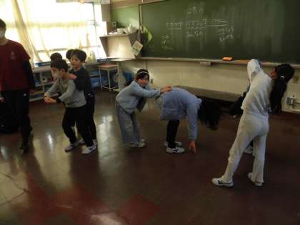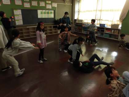 本日は、世田谷パブリックシアターの皆さんが来てくださっています。クラスごとに、ゲストティーチャーの方々と学習をしています。「いす」「コップ」など、友達と一緒に表現していましたが、とても楽しそうでした。