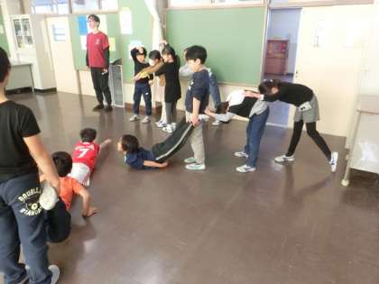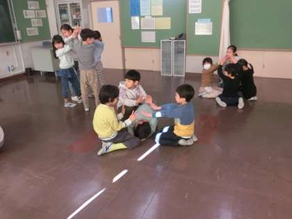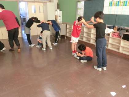 こちらのクラスでは、肉まんや象に変身しています。特徴を考え、互いに体の合わせ方などを工夫し、それぞれのものを表現しています。とても楽しそうです。