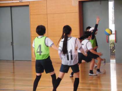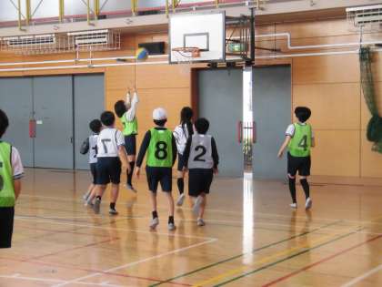体育のバスケットボールは、試合をすすめています。自分たちで審判も適切に行い、チーム内でもしっかりと声掛けができています。