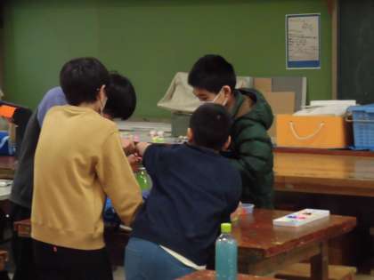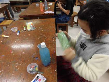 ペットボトルと絵具、ビー玉等を使って色水を作る活動を楽しんでいます。「赤と白を混ぜてみたら、こんな感じ。もう少し水を入れて薄めようかなあ」と思考錯誤しながら自分の思い描く色水を作ろうとしていました。