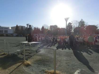 今日は月曜日、全校朝会があります。子どもたちが校庭に出てきました。