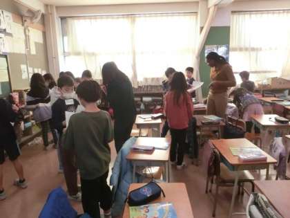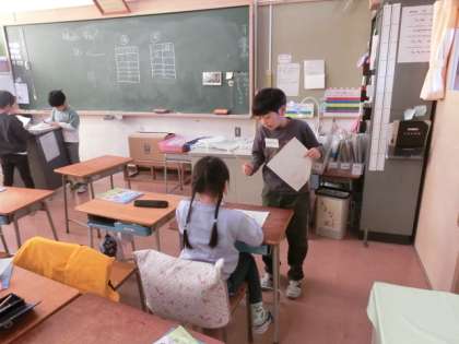 二人組になって、「Wha`t this?」の問いかけに、英語で返答をしていました。笑顔でやり取りする子どもたちです。