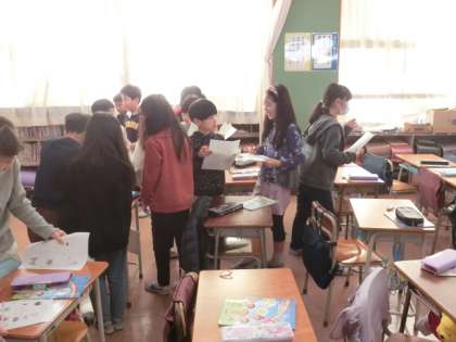 3年生の教室では、外国語の授業をしていました。ALTの先生が来ています。