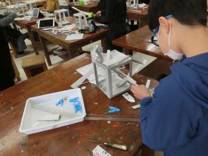 4年生の授業は図工です。「コロコロコロガーレ」と題して、ビー玉のコースづくりをしています。