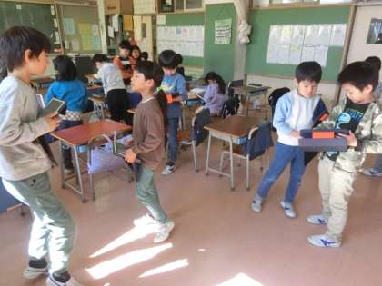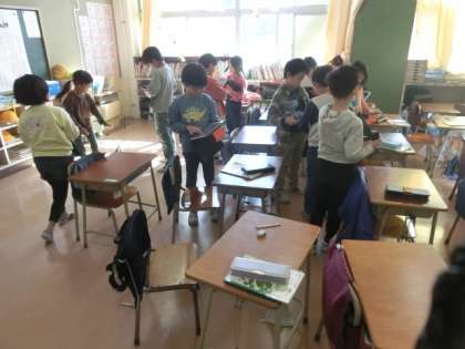 1年生の授業は国語です。言葉クイズを友達と出し合っています。