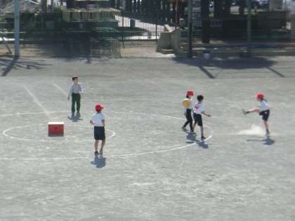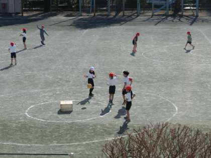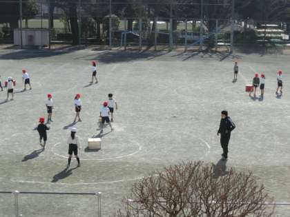 教室から校庭をのぞいてみると、2年生が体育をやっていました。ボール蹴りの的あてゲームです。