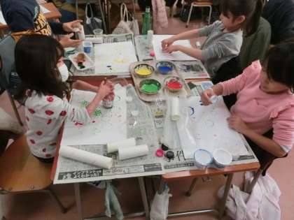 家から持ち寄ったものを使って、絵の具でスタンプをしています。