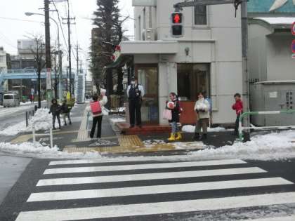 雪の積もった町の中、子どもたちが登校してきました。大きな雪玉を持って登校してくる人もいます。道のはじにある雪を触りながら、子どもたちは登校しています。「雪用のくつを履いてきたから大丈夫なんだよ。」そう言っている人もいます。子どもたちは積もった雪を見てとてもうれしそうです。