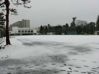 夜までの雪で校庭は一面真っ白です。しかし水分を多く含んでいるため、校庭には水も浮いてしまっています。乾いた雪がもっと降り積もりっているならば、たくさん校庭で雪遊びをさせたあげたいのですが、今の状態で少しでも入ってしまうと、泥だらけになってしまいます。子どもたちには申し訳ないですが、この雪では、校庭での雪遊びはできません。残念です。
