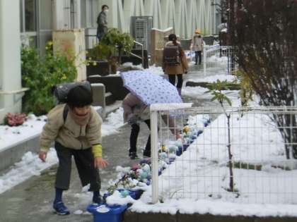 わたしが見たとき、2年生が、育てているパンジーにのっている雪を取り除いていました。優しいですね。