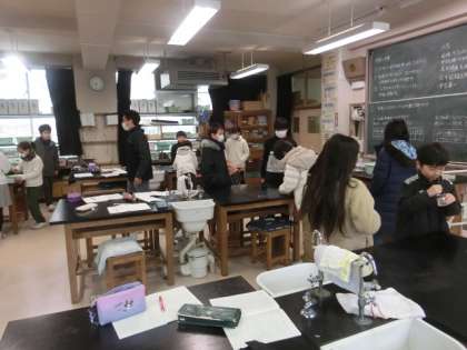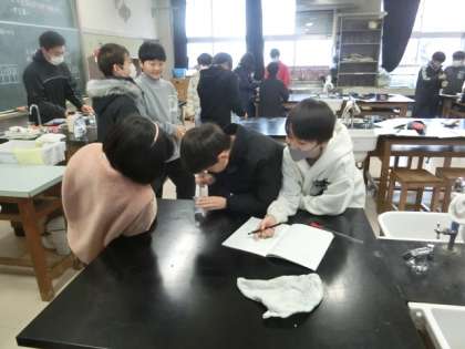 子どもたちは、ガラス棒でビーカーの水溶液をかき混ぜ、ビーカーに顔を近づけ、溶け具合を調べています。