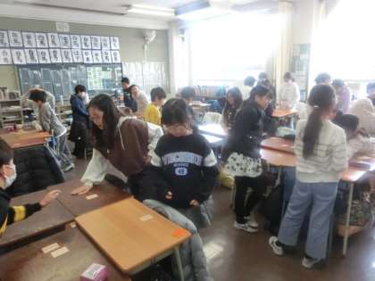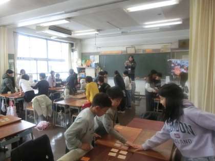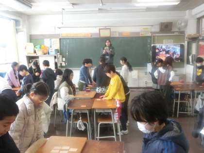 4年生の教室では百人一首をしていました。担任の先生が上の句を詠んだだけで、札をとっている人もいます。みんな真剣に、そして、楽しそうに百人一首を行っています。