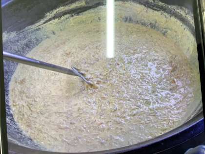 写真は他人丼の具に卵を入れ、加熱している途中の様子です。