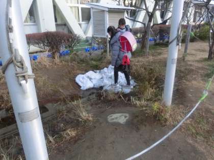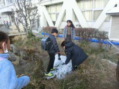 ビオトープにつんであった雪がビオトープに入り、道ができたといって、子どもたちがその道を歩いています。子どもたちはおもしろいことを考えます。