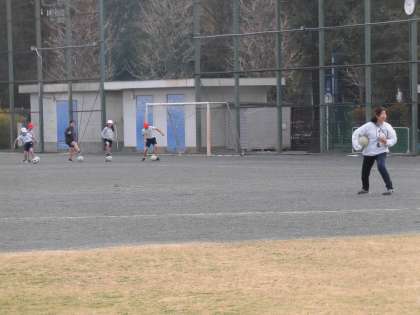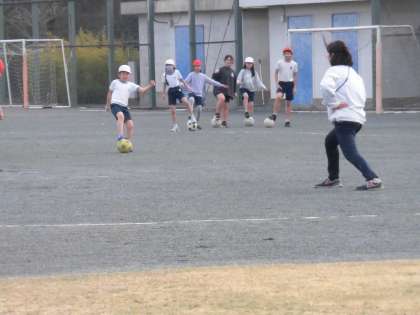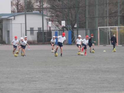 体育では、サッカーボールを使って「だるまさんがころんだ」をしていました。担任が振り向くと、子どもたちはぴたっとボールも動きも止めようとがんばります。担任が前を向く間にボールを転がしながら、そっと近づいていきます。楽しみながら、ボールの扱いに慣れてきていました。