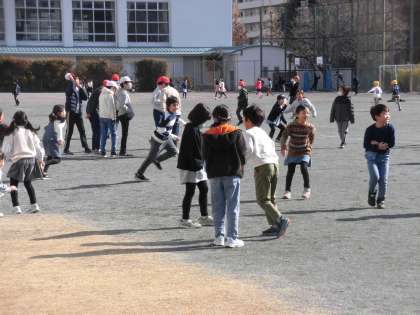 校庭の雪もとけ、久しぶりに中休みに校庭を駆け回ることができます。6年生はクラス遊びも行っていました。主事さんは、低学年の子どもたちと走り回り、いつも子どもたちに大人気です。