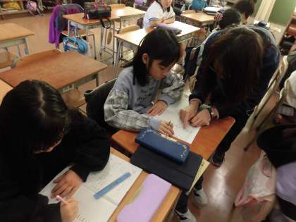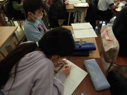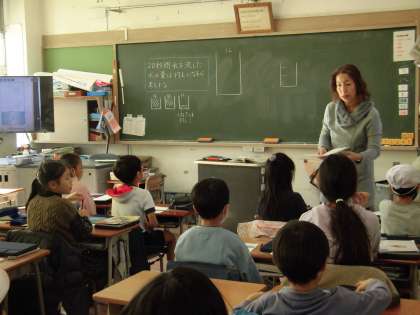 算数は、水の量のはしたの表し方について学習しています。ワークーシートに描かれたリットルますにメモリを書き込みながら、いくつ分のいくつまで水が入っているかを考えています。
