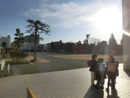 今日は土曜授業日、学校公開です。気持ちのよい朝の日差しが校庭に差し込んでいます。