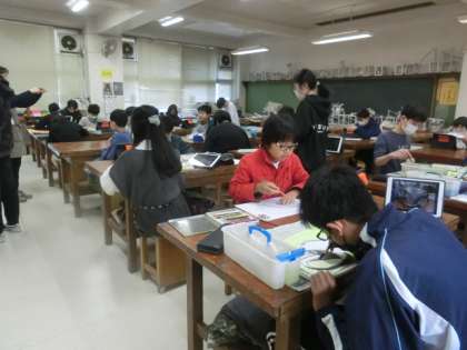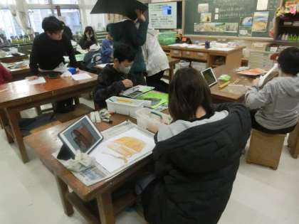 ランドセルのスケッチの仕上げをしています。絵の具の濃淡でうまく光の当たっているところと当たっていないところを表している作品が多くあります。
