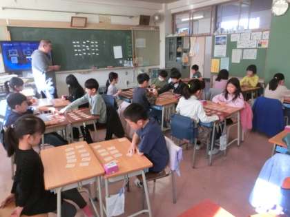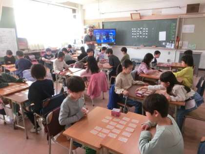 担任の先生が札を詠みあげると、子どもたちの手が動きます。覚えている人は、上の句の最初の方で札をとっています。