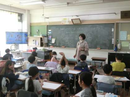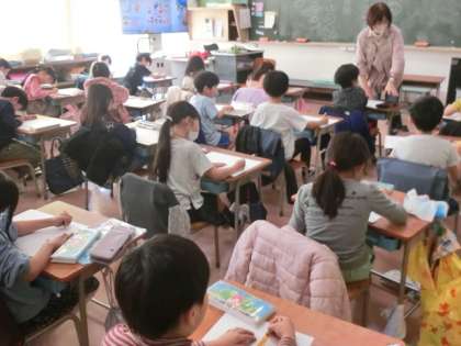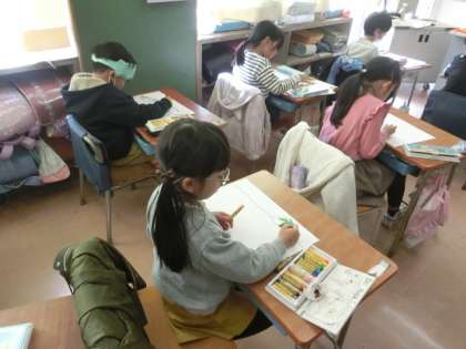 1年生の授業は図工です。「できなたいいな、こんなこと」と題し、やってみたいことを絵で表しています。
