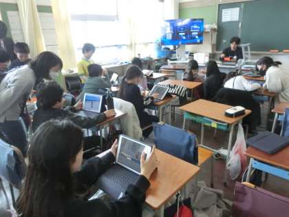 4年生の教室ではICT支援員の先生が入り、「成長を祝う会」の招待状をタブレットでつくっていました、招待状はプログラミングされ、アニメーションされています。ところどころに子どもたちの生まれたばかりのころの写真が、ちりばめられています。
