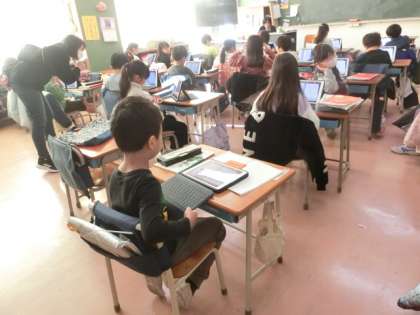 1組は国語の授業です。友達の書いた感想をタブレットで共有して、みんなで読んでいます。こうすることで、一人ひとりの作文をみんなで読むことができます。