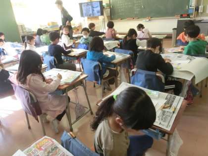 2組は図工です。「できたらいいな」と思うことを画用紙に描いています。子どもたちはとても楽しそうにクレヨンを動かしています。