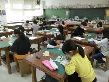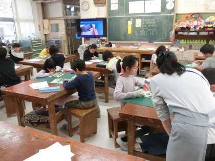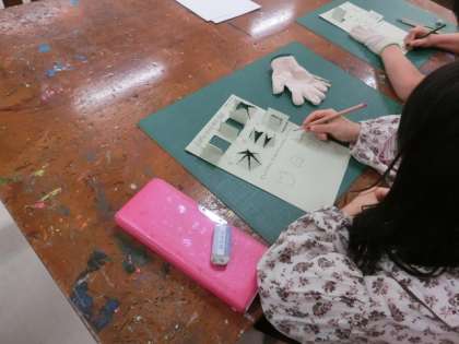 カッターを使って、紙にいろいろな形の窓を開けています。手を切らないか心配してしまいますが、子どもたちは、頑張っているので大丈夫です。