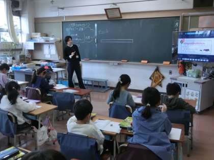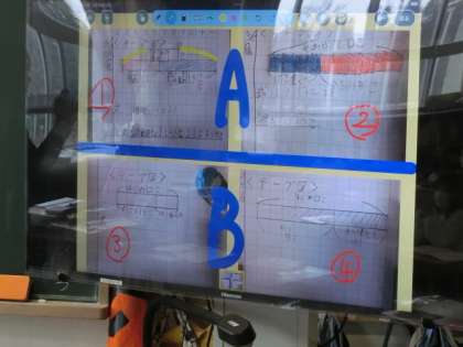 文章題の学習です。なに算でもとめるのかを、テープ図を使いながら考えています。テープ図の左側には何がくるのかをみんなで話し合っています。子どもたちのかいたテープ図をもとに考えています。こういう基本的なことをしっかりと考えることも大切ですね。
