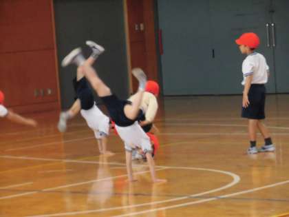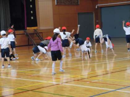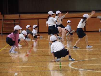 体育の学習のはじめには、いろいろな動きに挑戦しています。かえるの足うちでは、1回の足うちから、2回にチャレンジです。素早く足を動かすことも必要になります。