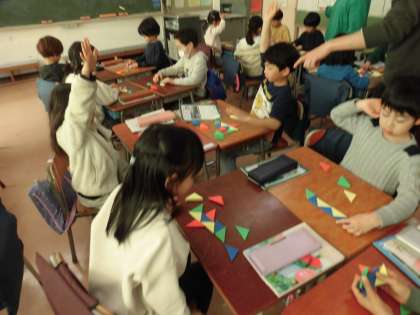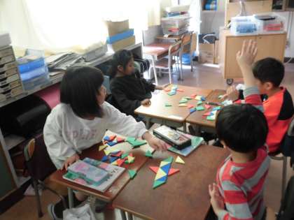 算数のブロックを作った形づくりです。画面に映し出された形を組み立てるのは、なかなか難しいものです。手元に見本があると、捉えやすいようです。友達同士で確かめ合いながら、かたちづくりをしました。