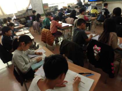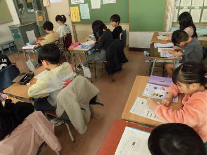 算数は、単元の内容の確認プリントに取り組んでいます。はやく終わらせるだけでなく、確かめたり、丁寧に書いたり、図に表したりすることも大切になります。
