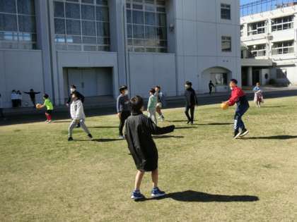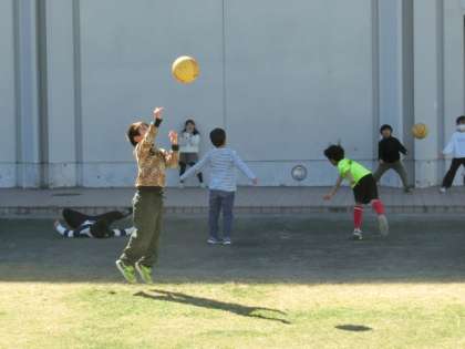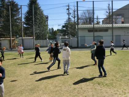 北風が強く吹いていますが、子どもたちは元気に走り回っています。
