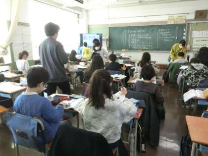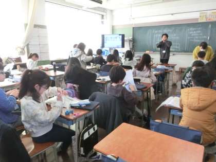 子どもたちは、面の位置を考えながら工作用紙に線をかいています。