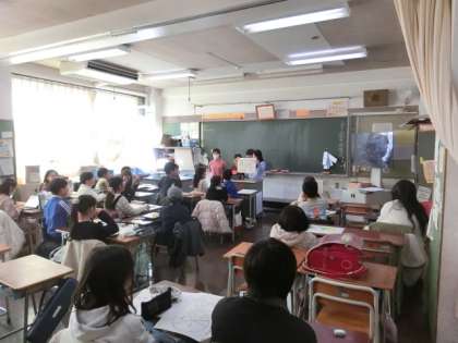 4年生の授業は国語です。身の回りの事がらについて自分たちで調べて、発表する学習です。