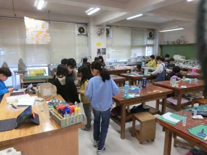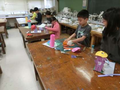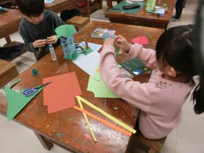 カッターを使って窓をくりぬき、いろいろな形の窓のあるマンションをつくっています。子どもたちの発想はとてもユニークです。嬉しそうに「見て、見て。」と声をかけられました