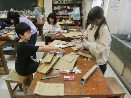 段ボールを使って、自分の考えた思い思いの作品を作っています。段ボールという素材の特性をどのように生かすのかが、大切になります。