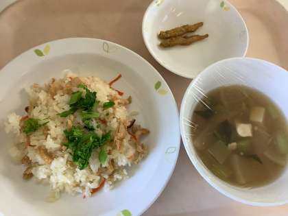 ひな祭り献立です。こぎつね寿司は油揚げのたくさん入ったちらし寿司です。今日は「わかさぎのカレー揚げ」が人気で、魚が苦手な子も食べていました。