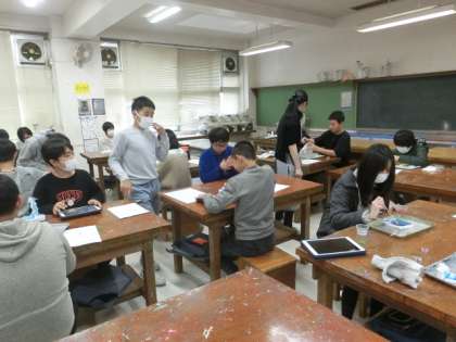 6年生の授業は図工です。「マイウォーターラグーン」の仕上げの時間です。