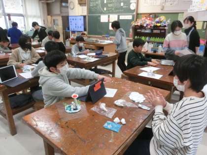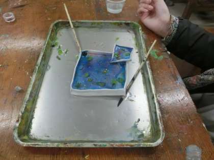 洗濯のりに染料を入れて、水がただようイメージを演出しています。人によっては、赤を混ぜている人もいます。赤が入ることで、一味違う水辺のイメージになります。作品について話を聞くと、楽しそうに話をしてくれる6年生です。
