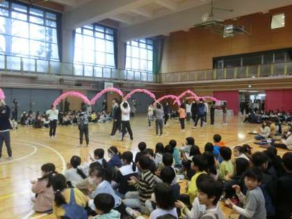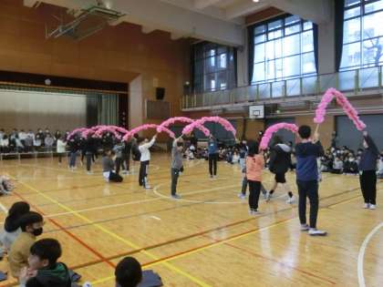 1年生から5年生までが体育館で6年生の入場を迎えます。4年生が持つ花のアーチをくぐり、6年生が入場してきました。