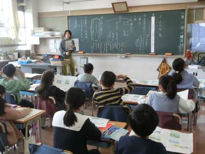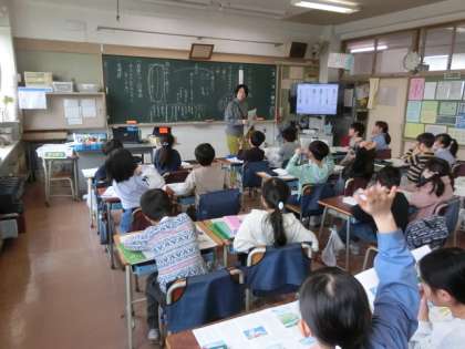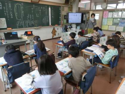 2年生の授業は国語です。物語「スーホの白い馬」の学習です。自分たちで設定した計画に沿って学習をすすめています。登場人物や物語の背景について、みんなで確認をしていました。